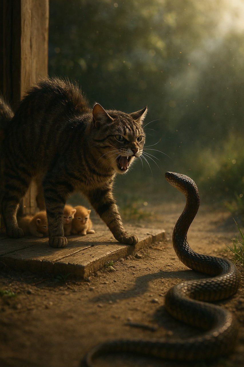 Tato kočka udělala něco neuvěřitelného – postavila se hadovi a chránila svá novorozená koťata 😱🐱🐍 Brzy ráno se z trávy vyplazil dlouhý had, který mířil k malým koťátkům. Ale mezi nimi a nebezpečím stála dospělá kočka, syčela a blokovala cestu – nedovolila hadovi přiblížit se ani na centimetr. Koťata se choulila v bezpečí a napětí stoupalo… 👉 Co se stalo potom, nikdo nečekal! Pokračování v komentářích 👇