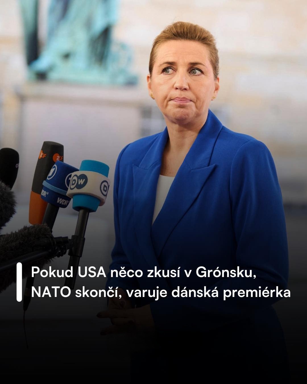„Chci však také jasně říci, že pokud se USA rozhodnou vojensky zaútočit na jinou zemi NATO, všechno skončí. Včetně našeho NATO a tím i bezpečnosti, která byla zajištěna od konce druhé světové války,“ cituje TV2 dánskou premiérku.Na dotaz, zda se domnívá, že by k tomu mohlo dojít, pak odpověděla následovně: „Dělám vše, co je v mých silách, aby se to nestalo. Věřím v demokracii a mezinárodní pravidla. A také věřím, že hranice se jen tak nemění.“
