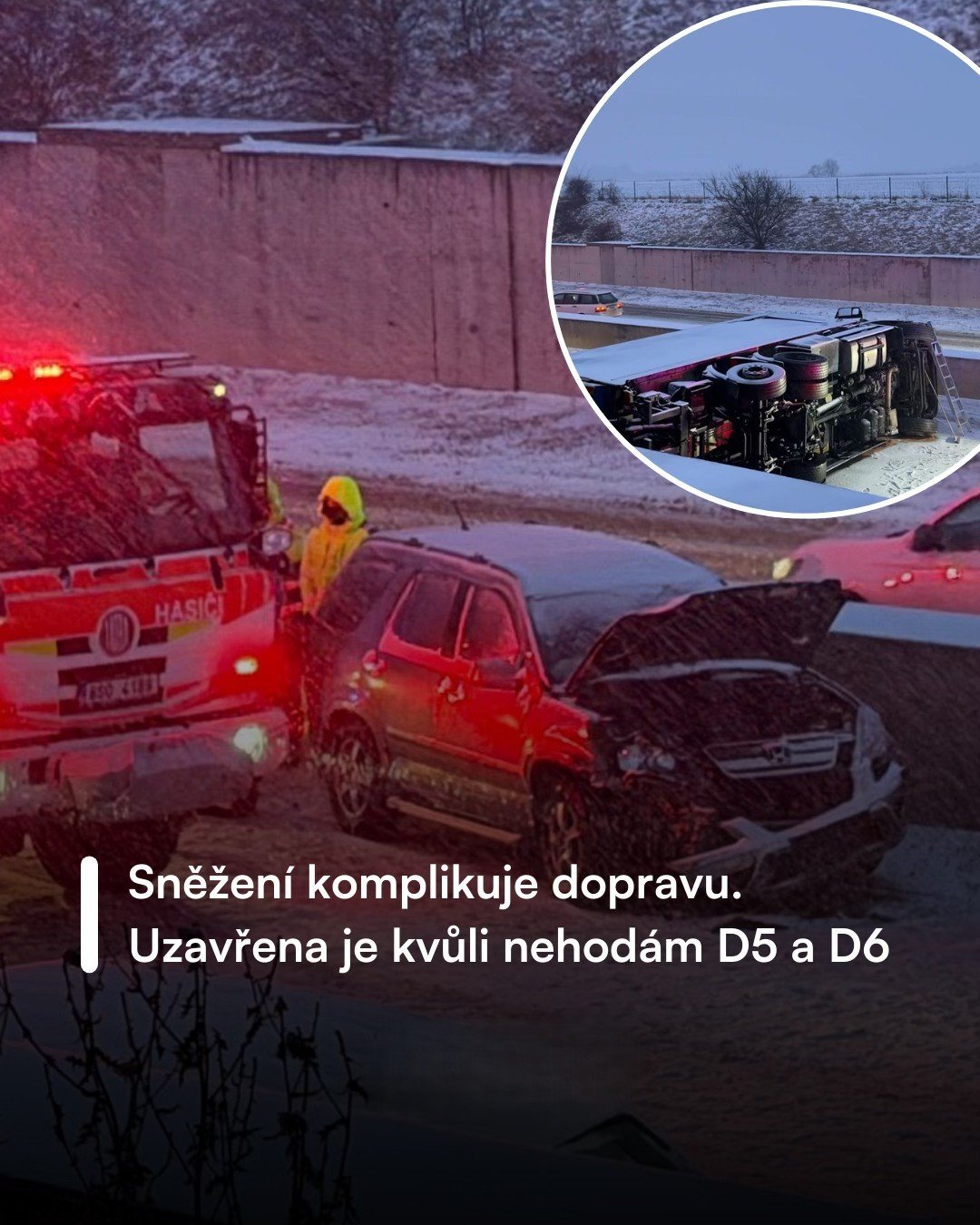 Ve Středočeském kraji se situace vyostřila do dramatické podoby. Na D6 u Hostivic došlo k hromadné nehodě kamionu a dvou osobních vozů. Nákladní vůz dostal smyk a převrátil se na bok napříč pruhy, dvě auta již nestihla zastavit. Následné odstraňování vozidel způsobilo další komplikace a zablokovalo dopravu na několik hodin.