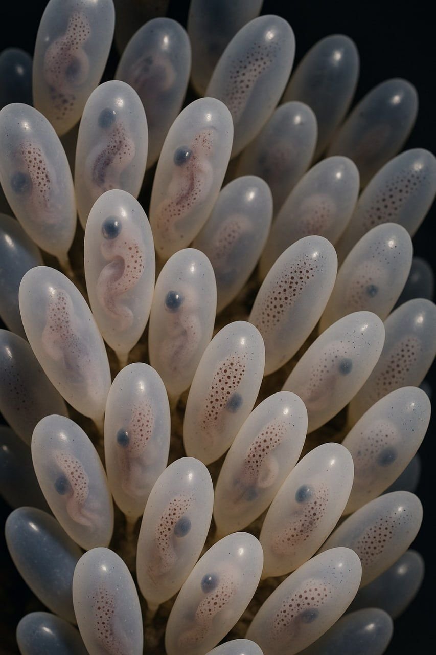 Před námi leželo… něco živého. Celá kolonie podivných, protáhlých, mléčně průhledných kapslí, pevně stlačených k sobě. Jejich mokré povrchy se leskly, jako by je někdo právě pečlivě uspořádal. Ale nejstrašidelnější bylo uvnitř. Když jsme si baterku přiblížili, sevřelo se nám srdce: v každé kapsli se něco pohybovalo.